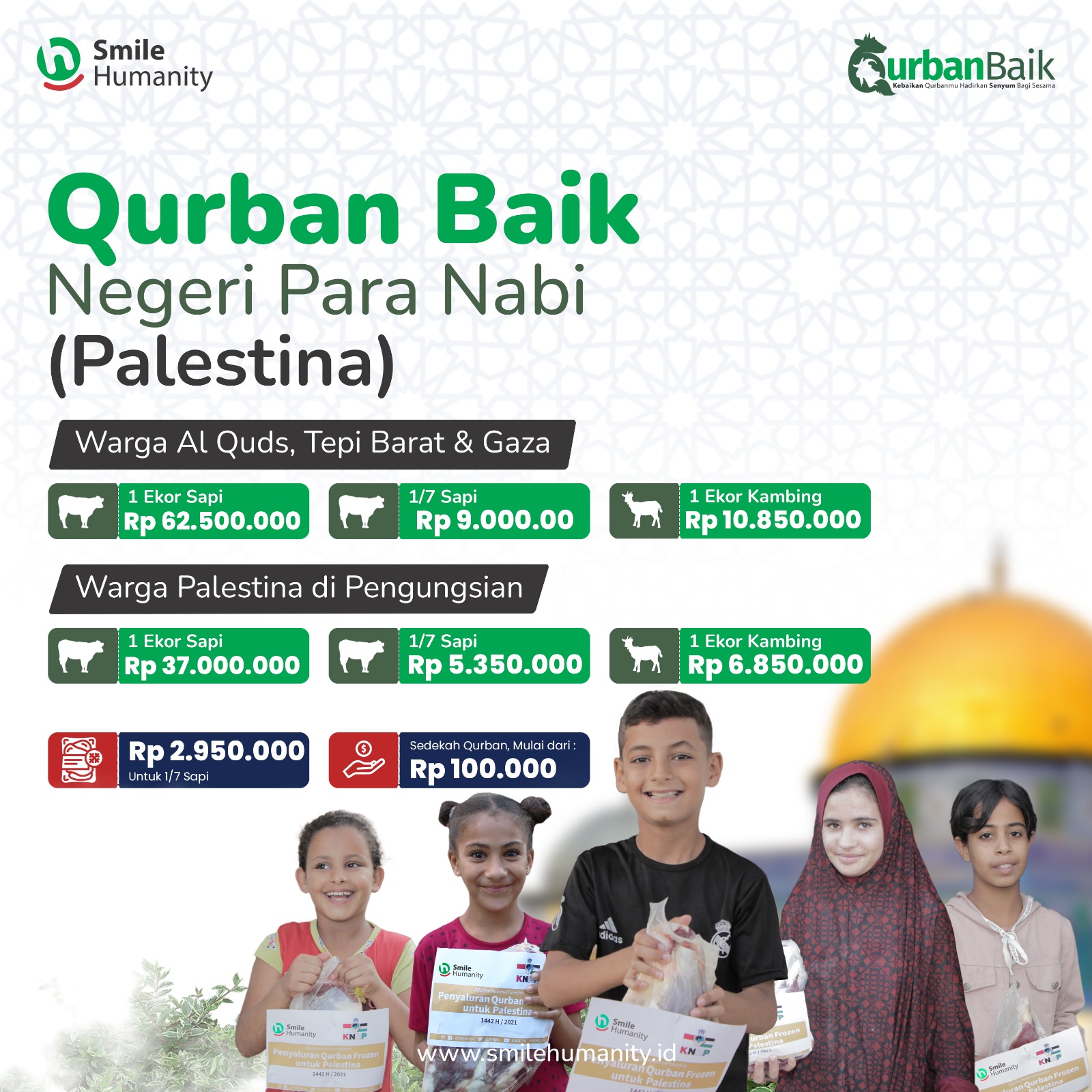 Smile Humanity bersama lembaga KNRP menginisasi program “Tebar Daging #QurbanBaik Frozen ke Negeri Anbiya (Palestina)” bertujuan untuk berbagi Senyum dan Kebahagiaan di hari Raya ‘idul Adha khususnya kepada saudara-saudara kita yang sedang memperjuangkan hak kemerdekaan negara mereka di wilayah konflik Palestina. Terlebih masih banyak saudara-saudara kita di sana yang sangat jarang merasakan makan daging akibat krisis yang berkepanjangan.